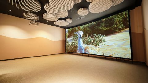 The Visitor Centre at the Dubai Desert Conservation Reserve is a journey of discovery, education and insight. Located in the heart of the Dubai Desert, the Centre tells the story of the incredible conservation work taking place on the dunes surrounding it, told across a range of specially themed rooms designed to encapsulate every element of the Reserve’s wildlife, history and current work. Upon entering the Visitor Centre’s reception hall, guests are greeted by an expansive open space adorned with captivating visuals. A substantial wall and stretch ceiling host a showcase of breathtaking photography, including a centrepiece of the Arabian Oryx in their natural habitat. An interactive kiosk beckons visitors to explore a detailed map of the Reserve, aiding in the discovery of elusive wildlife like the Arabian Fox, enhancing the overall immersive experience. The Cultural Hall provides a deeper understanding of the DDCR's remarkable journey, from its establishment in 1999 as a trailblazer in protected areas within the UAE to its current status as a successful model for habitat conservation, managed tourism, education, and scientific research. It delves into key milestones and showcases the integral cultural elements intertwined with the UAE's desert heritage, such as falconry, date farming, and camel farming, all of which are integral to the DDCR's rich history. In the AV hall, a cinematic experience awaits guests in the form of a beautifully produced feature film, providing an insightful overview of the Reserve and its vital role in conservation efforts. The habitat hall proudly displays the diverse indigenous flora and fauna of the Reserve, tackling any potential misconceptions that visitors may have about the bounty of the desert. Through true-to-life 3D-printed models, holographic displays, interactive kiosks, and push-button devices, visitors can gain a comprehensive understanding of the vibrant ecosystem within the DDCR. Audio melodies of various bird species found inside the Reserve enhance the interactive experience, complemented by real-life specimens on display, catering to avid nature enthusiasts. Shifting the perspective to sunset in the Dubai desert, the nocturnal hall offers a groundbreaking experience. A dome display utilizes cutting-edge technology to provide an immersive showcase of the nocturnal wildlife inhabitants of the DDCR, offering a fascinating and educational glimpse into the Reserve's nighttime ecosystem.