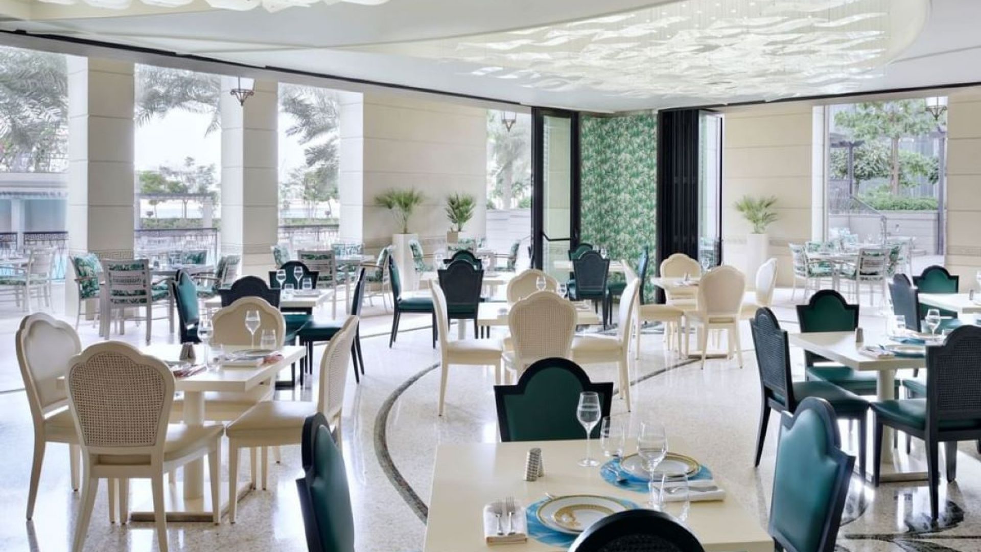 A lavish all-day dining restaurant known for its jungle-themed interior, featuring marble flooring, Versace wallpaper, and an opulent atmosphere. offering a diverse international buffet with live cooking stations, specializing in seafood and Italian, Indian, Asian, and Middle Eastern cuisines, alongside a memorable dessert selection. The restaurant provides a sophisticated yet relaxed environment, extending to a spacious outdoor terrace.