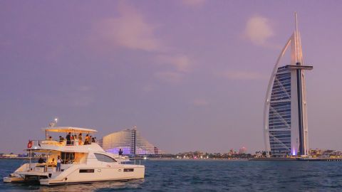 Experience the unmatched charms of Dubai by moonlight during an enchanting Twilight Yacht Tour. As you step aboard a luxurious yacht, you'll be transported to a world of sophistication and refinement. Before embarking on this unforgettable journey, you'll be greeted by a qualified crew dedicated to providing exceptional service throughout the evening. As you sail through the mesmerising Dubai Marina, you'll be treated to awe-inspiring views of iconic landmarks. Marvel at the beloved Jumeirah Beach and the magnificent man-made Palm Jumeirah, pass the iconic Ain Dubai, and take stunning photos with the majestic Burj Al Arab serving as your backdrop. Immerse yourself in the relaxed and lively ambiance whilst savouring mouth-watering barbeque dishes, prepared by our skilled chefs. Don't forget to mingle on this shared tour, as you'll be accompanied by other discerning guests.